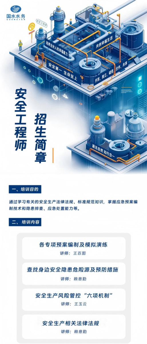 “安全是底線,人才是防線?!?/strong>近日,國水水務(wù)“安全工程師崗位培訓(xùn)+內(nèi)部安全攻堅活動”雙軌行動正式啟動。這不僅是公司深化“學(xué)安全、強技能、固防線”內(nèi)部建設(shè)的關(guān)鍵舉措,更標志著國水水務(wù)將“自我安全賦能” 的實戰(zhàn)經(jīng)驗,轉(zhuǎn)化為面向涉水企事業(yè)單位的 “安全人才培育+安全體系搭建” 培訓(xùn)產(chǎn)品正式成型?—— 既實現(xiàn)自身安全人才專業(yè)化、內(nèi)部安全管理標準化,更能為客戶提供 “可復(fù)制、可落地” 的安全培訓(xùn)和安全生產(chǎn)服務(wù),真正做到“先筑牢自家籬笆,再為客戶遮風擋雨”。